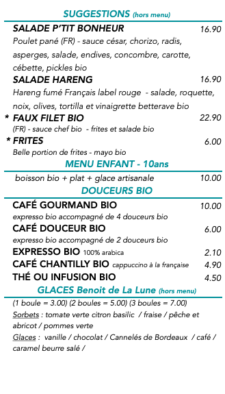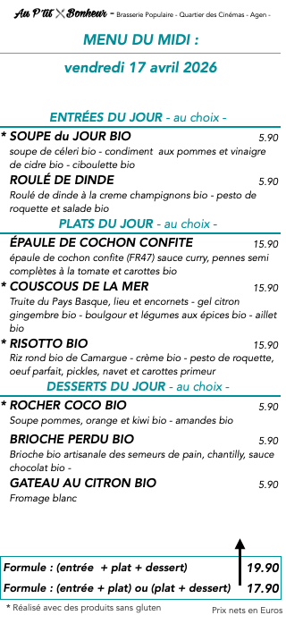 le menu du midi est publié le matin au plus tard à 10h - bien regarder la date qui figure sur le menu - des changements de dernières minutes peuvent survenir merci de votre compréhension